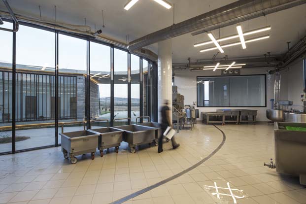 Eliptik formu sayesinde hem iç hem dış olarak algılanabilecek bir iç avlu oluşturan, bu avluyu da ziyaretçilerin ve personelin tüm üretimi 360° gözlemleyebileceği deneysel bir alana dönüştüren 38° 30° Çiftliği Peynir Fabrikası’nın iç cephesi ekran niteliğinde kurgulanarak üretim bandının dışarıdan izlenebilmesi sağlanmış. Fabrika yapısı; anıtsal formu, davetkar saçağı ve sunduğu avlulu tipoloji ile kendini bir çeşit peynir müzesine dönüştürerek tüm işlevlerini dairesel bir formda tamamlıyor.