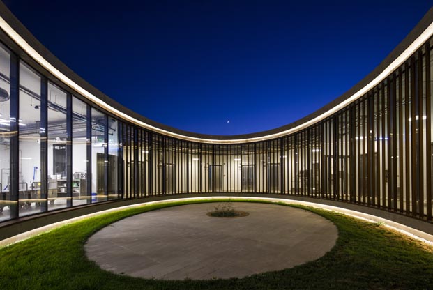 Klasik fabrika yapısının gerektirdiği tüm işlevlerin dairesel bir bantta maksimum verimle sağlayan 38° 30° Çiftliği, anıtsal formu, davetkar saçağı ve sunduğu avlulu tipoloji ile kendini bir çeşit peynir müzesine dönüştürüyor. Eliptik formu sayesinde hem iç hem dış olarak algılanabilecek bir iç avlu oluşturan, bu avluyu da ziyaretçilerinin ve personelin tüm üretimi 360° gözlemleyebileceği deneysel bir alana dönüştüren 38° 30° Çiftliği’nin iç cephesi ekran niteliğinde kurgulanarak üretim bandının dışarıdan izlenebilmesi sağlanmış.