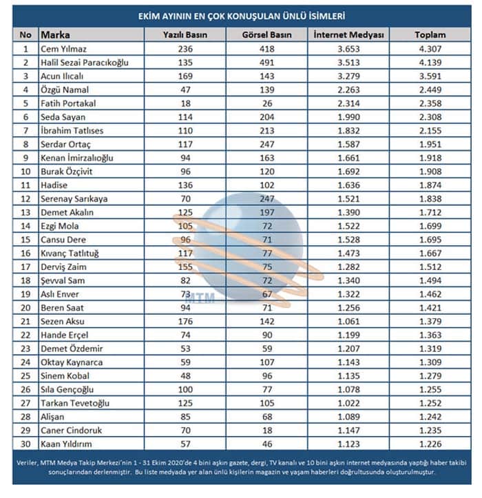 Aşk ve iş hayatı ile ay boyunca toplam 4 bin 307 habere adını yazdıran Cem Yılmaz, Ekim ayının en popüler ismi olarak magazin gündeminin zirvesine adını yazdırdı. MTM’nin aynı raporuna göre Serenay Sarıkaya ise ay boyunca toplam bin 838 haberde yer aldı.