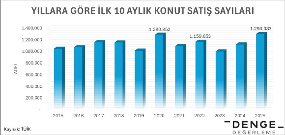 TÜİK verileri, konut satışlarında ekim ayındaki yeni zirveyi kayıtlara geçirdi. Bir önceki aya göre yüzde 9 artarak 164 bin 306’ya yükselen konut satışları, yıl bazında 1 milyon 293 bin 33 adetle rekor kırdı. Verileri değerlendiren Denge Değerleme Genel Müdür Yardımcısı Latif Aksoy, “Bir sürpriz yaşanmazsa yıl sonunda en yüksek yıllık konut satışı sayısına ulaşılacak.” dedi.