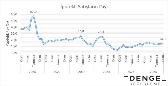 Toplam konut satışları içindeki ipotekli satışların payı, önceki aylara paralel seyrini sürdürüyor. Ekim ayında toplam satışlar içindeki payın yüzde 14,3 olarak gerçekleştiğini hatırlatan Aksoy, “Geçen yılın ilk 10 ayına göre adet bazında yüzde 64’lük ciddi bir artış kaydedilmiş olsa da mevcut faiz oranları ve kredi kısıtlamaları nedeniyle 2019-2020 yıllarındaki yüzde 30-35’lik pay seviyeleri hâlâ çok uzakta. Diğer taraftan kredi erişiminin sınır olması alternatif olarak tasarruf finansmanı modelini öne çıkarttı. Son yıllarda hızla çoğalan tasarruf finansmanı şirketleri, özellikle orta gelir grubunun konut sahibi olma yolunda giderek daha çok tercih ettiği bir kanal haline geldi. 2026’da beklenen faiz indirimleri ve bu alternatif modellerin daha da yaygınlaşmasıyla birlikte ipotekli satışların toplam satışlar içindeki payının yeniden yükselişe geçmesi güçlü bir ihtimal.” dedi.