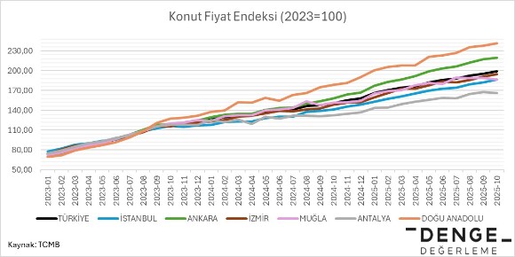 Ekim ayı konut fiyat endeksi verilerine göre yıllık en fazla değişim yüzde 38,4 ile Ankara ve yüzde 35,3 ile Doğu Anadolu illerinde gerçekleşti. En az değişim ise yüzde 23,1 ile Muğla ve yüzde 25,3 ile Antalya hattında kaydedildi. Bölgesel fiyat artışları arasındaki makasın giderek daraldığını vurgulayan Aksoy, “Konuta olan talebin ülke geneline yayıldığını söyleyebiliriz.” dedi.